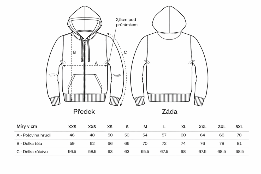 Zde vám nabízíme tabulku velikostí (hodnoty jsou v cm). Zkuste poměřit s některým tričkem se kterým jste spokojeni a následně vyberte vhodnou velikost.